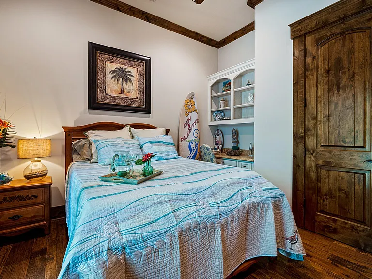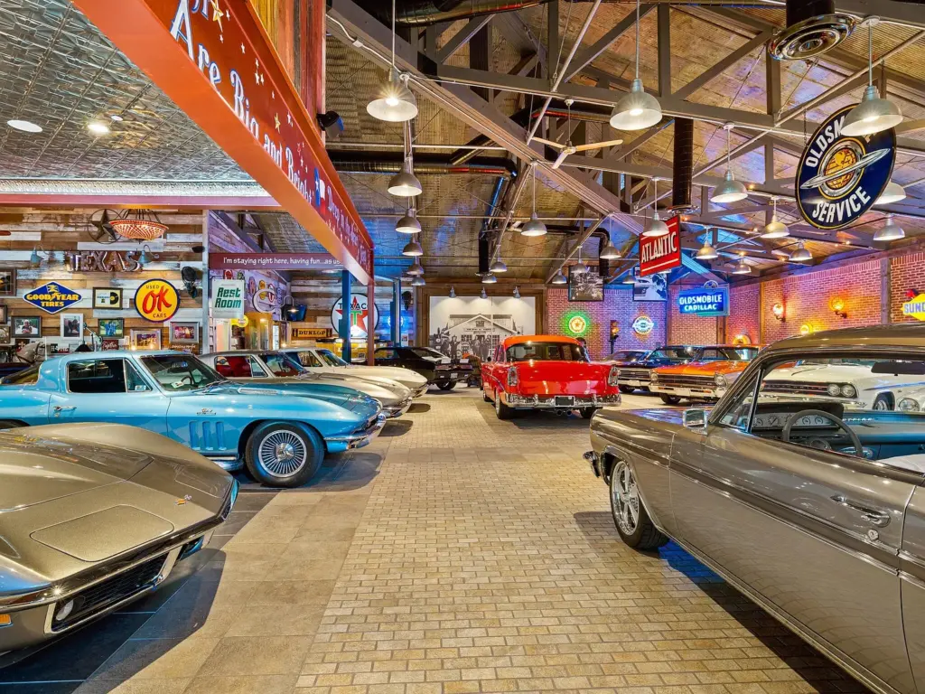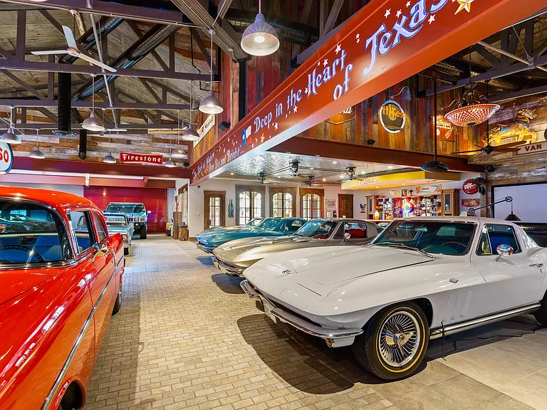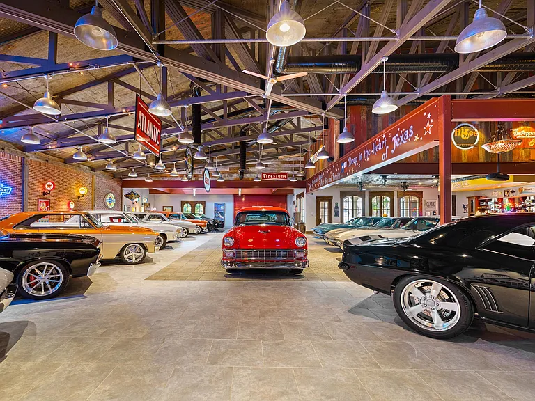 Built in 2008 on a former limestone quarry site just five miles from downtown McKinney, the property’s signature feature is its 6,200-sq.-ft. automotive showroom, designed to showcase and preserve valuable automotive collections year-round. The space incorporates 100-year-old reclaimed barn timbers, creating an authentic yet sophisticated environment. A 1950s-style soda fountain bar adds period character, transforming the showroom into an ideal venue for private events and car club gatherings.