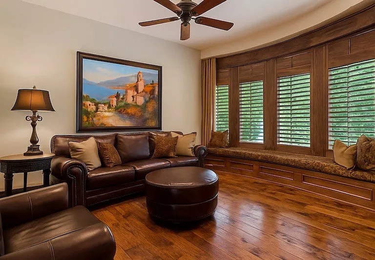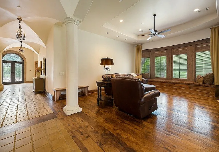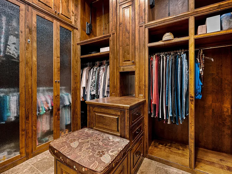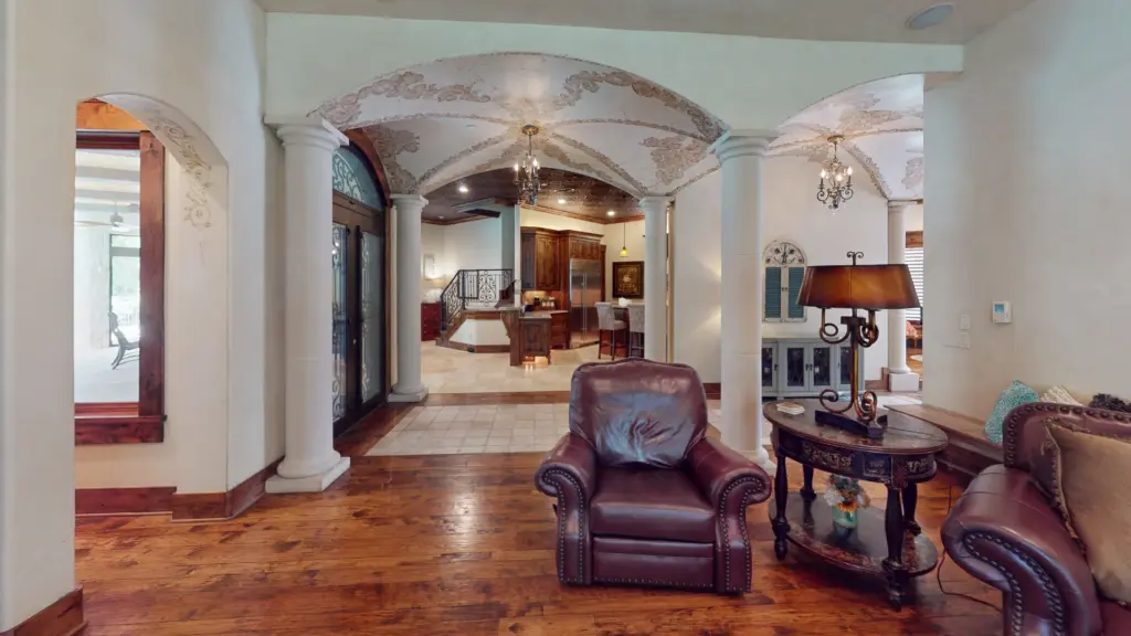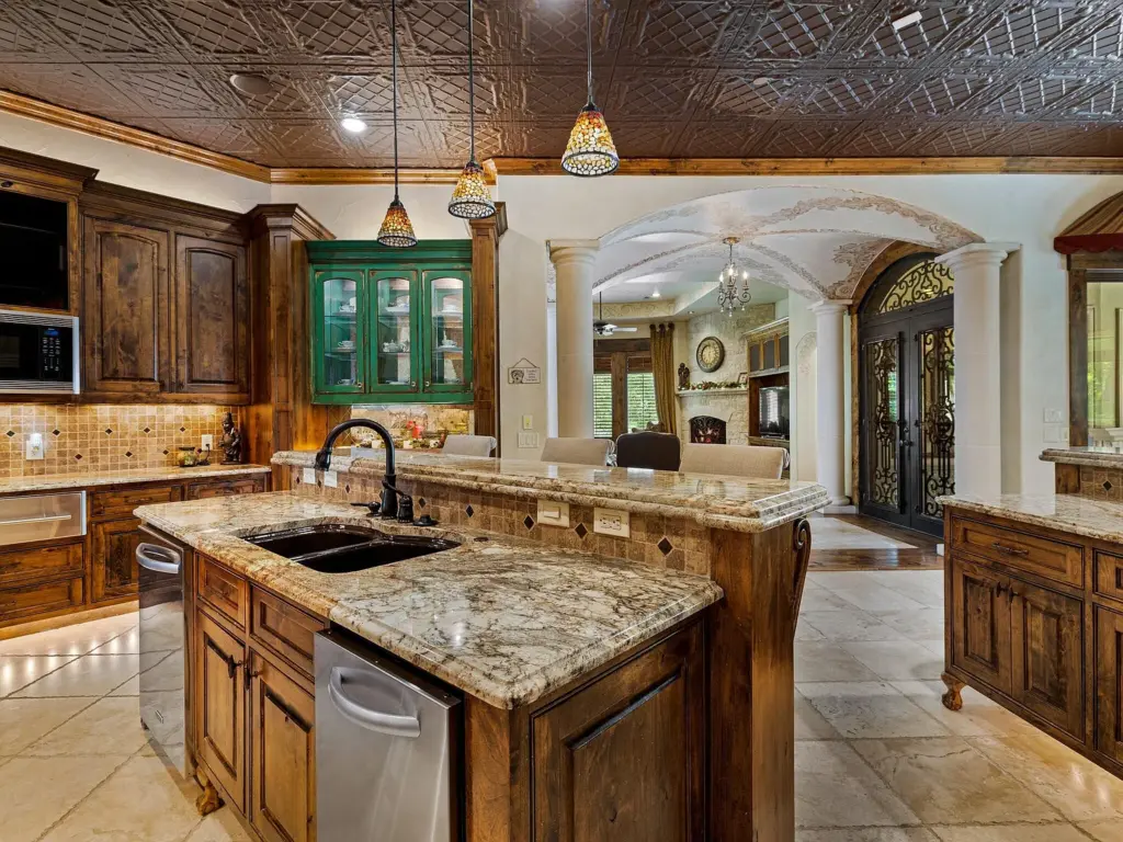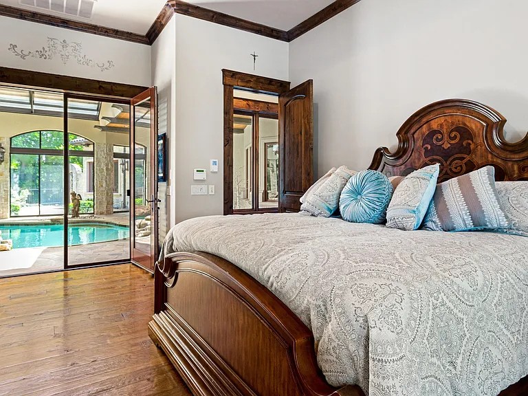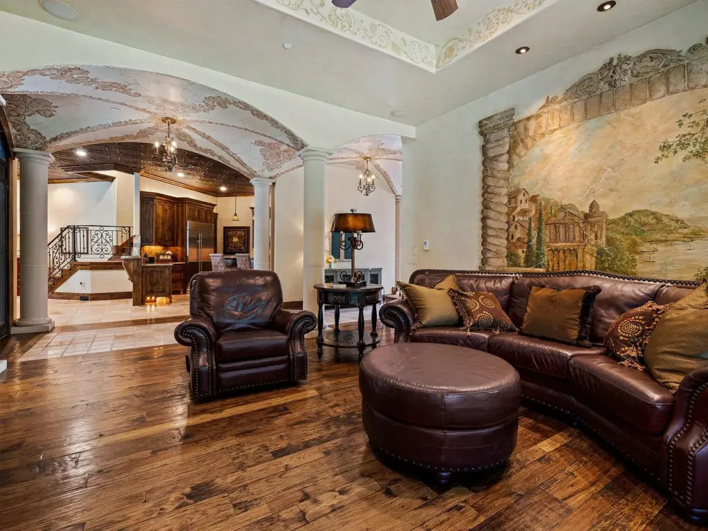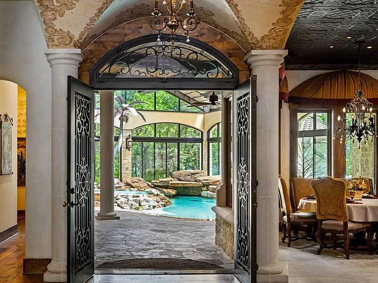 The main residence features four bedrooms, six bathrooms, and a chef’s kitchen with premium appliances. A sunroom with a pool and retractable glass walls and ceiling creates seamless indoor-outdoor living. Vaulted ceilings, stone fireplaces and arched doorways reflect the Tuscan design, while a theater and workout room offer luxury amenities.