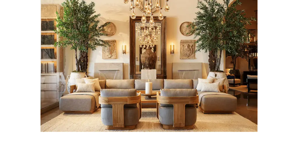 RH Outdoor: This level integrates stunning outdoor lounge spaces, featuring pleached London plane trees, shade canopies, sculptural evergreens, and French limestone fire tables, showcasing the sophistication of outdoor living.