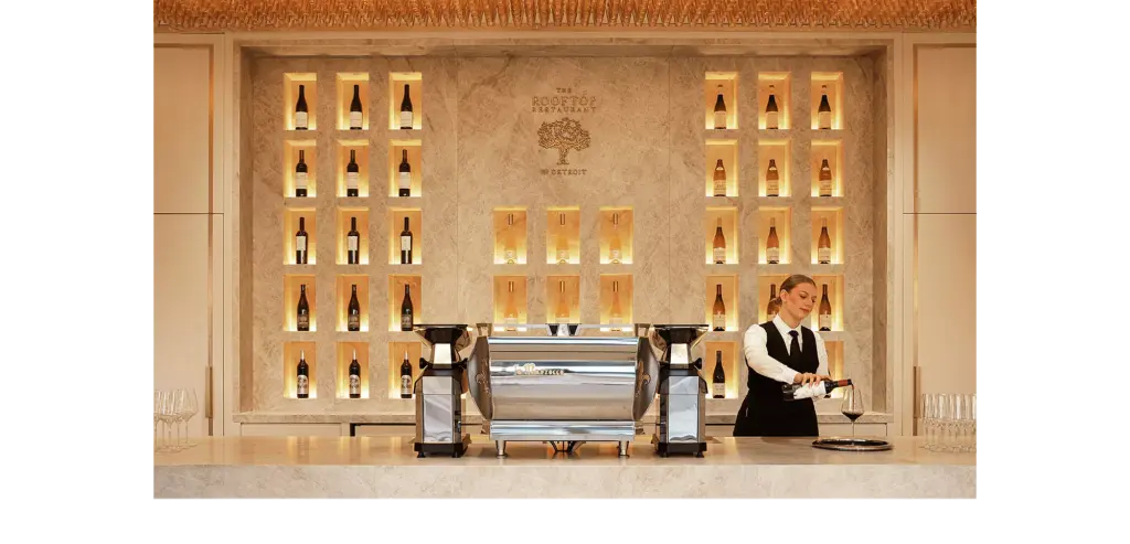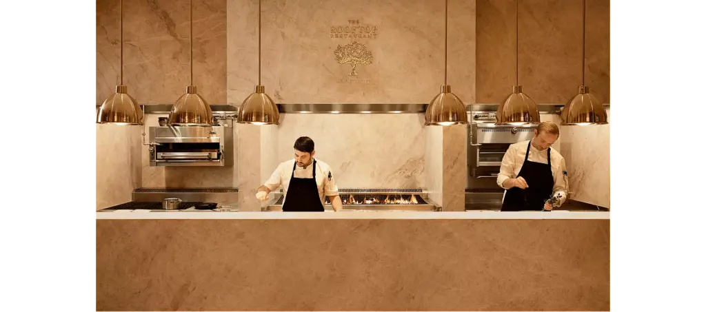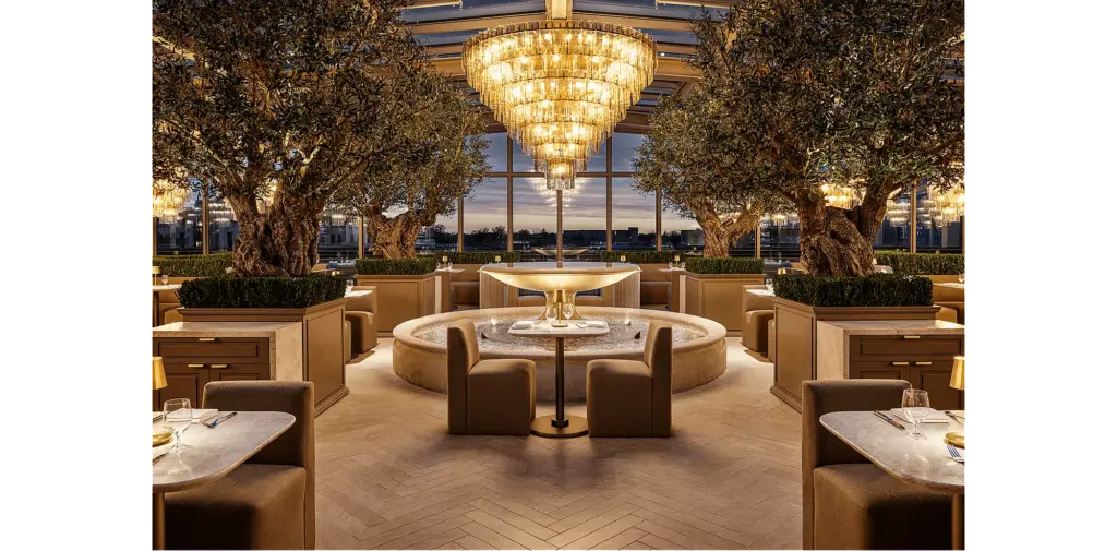 Cuisine: The menu is a curated selection of American and Mediterranean classics, complemented by an exposition kitchen, a wine bar clad in natural Taj Mahal stone, and a selection of Champagnes and wines.