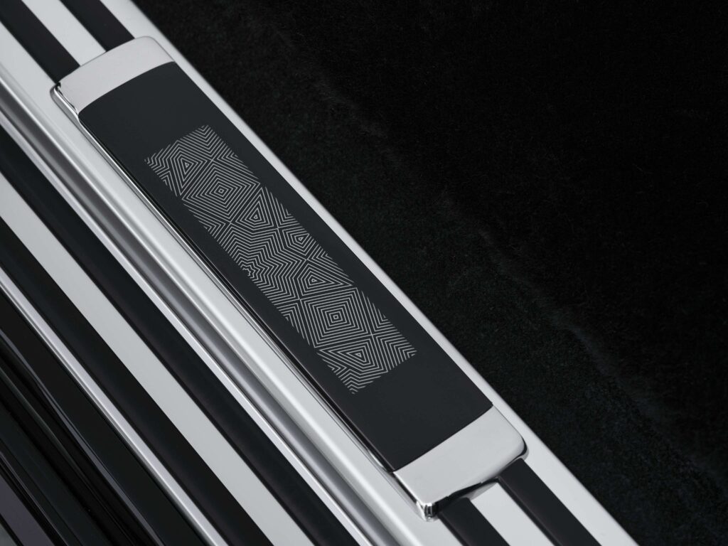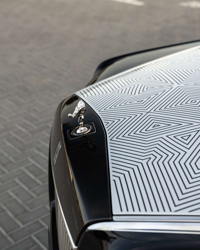 The mashrabiya motif flows throughout the motor car — from the engraved bonnet and hand-painted coachline to the Blackwood and Black Bolivar marquetry Gallery artwork and embroidered interior details. Finished in Diamond Black and Silver with refined Dark Chrome accents, the exterior complements a serene interior in Selby Grey and Black leather, complete with Bespoke motifs, Starlight Doors and illuminated treadplates.