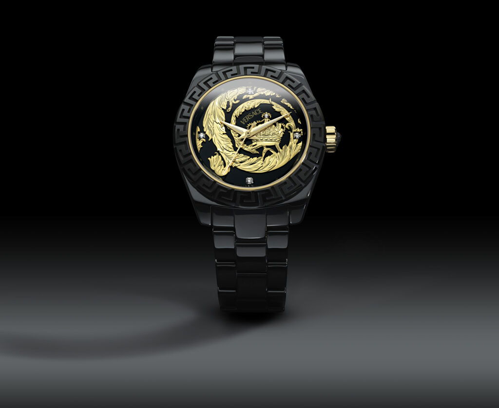 The dial also differs from the 2005 model. It features a black enamel base with a gold-tone 3D Barocco pattern, drawn from Versace’s archives. Four diamonds are set into the dial as hour markers, with a fifth diamond placed into the crown, while the Versace logo appears at 3 o’clock. Understated, this is not.