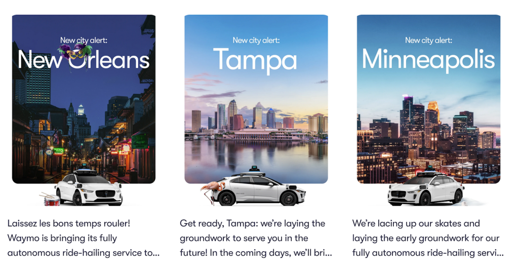 A spokesperson said Waymo will wait until its technology is validated in Minneapolis, Tampa and New Orleans before committing to 2026 service launches.
