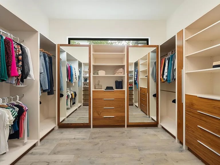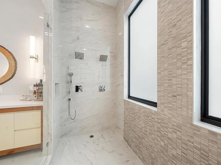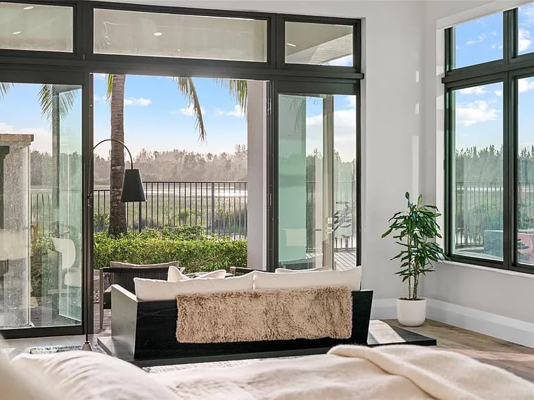 The seven en-suite bedrooms ensure comfort and privacy for everyone, but the Primary Suite stands out as a true retreat. It boasts custom dual walk-in closets, a relaxing lounge area, and incredible views of the lake. The luxurious spa-like bathroom features dual vanities, a soaking tub, and sleek, modern finishes, complemented by a private bar area with a mini fridge for quiet evenings.