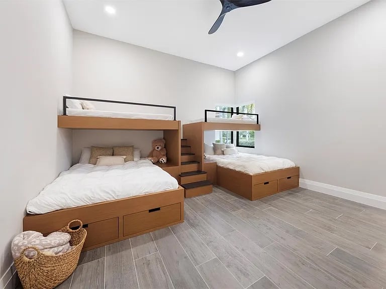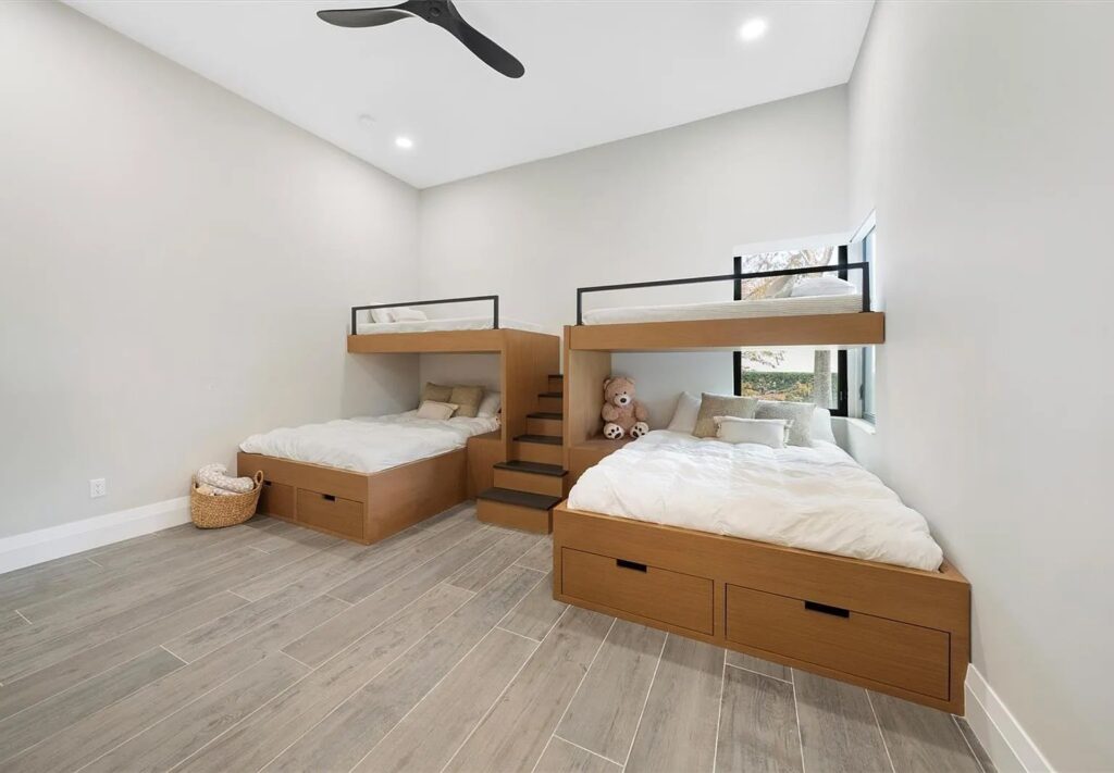 For families, the separate children’s area is a thoughtful addition, complete with a custom bunk room that features four built-in beds, a dedicated playspace, and a private bath.