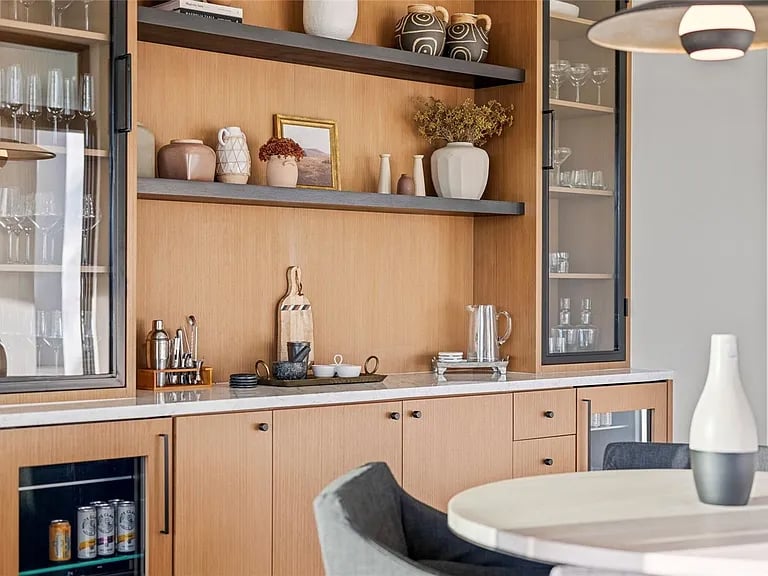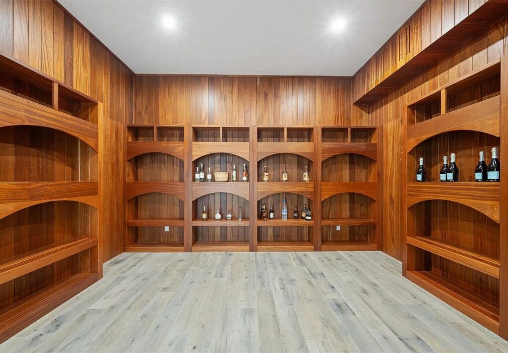Beyond the kitchen, the home is equipped for luxury leisure with a cinematic media room and a chic wine storage room featuring modern built-in teak shelving.
